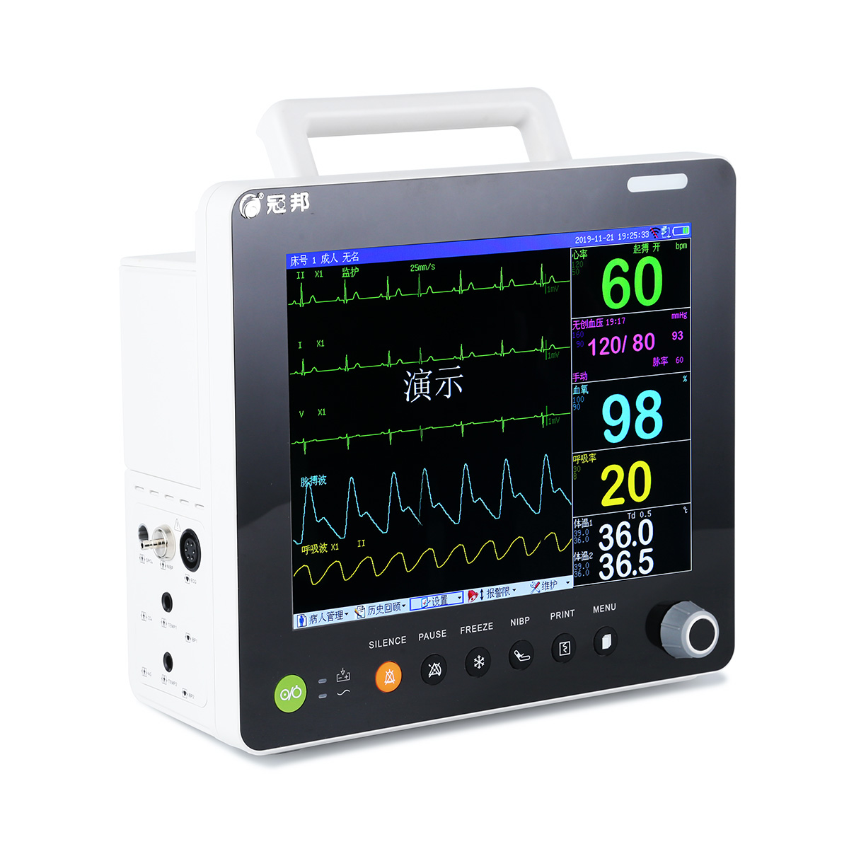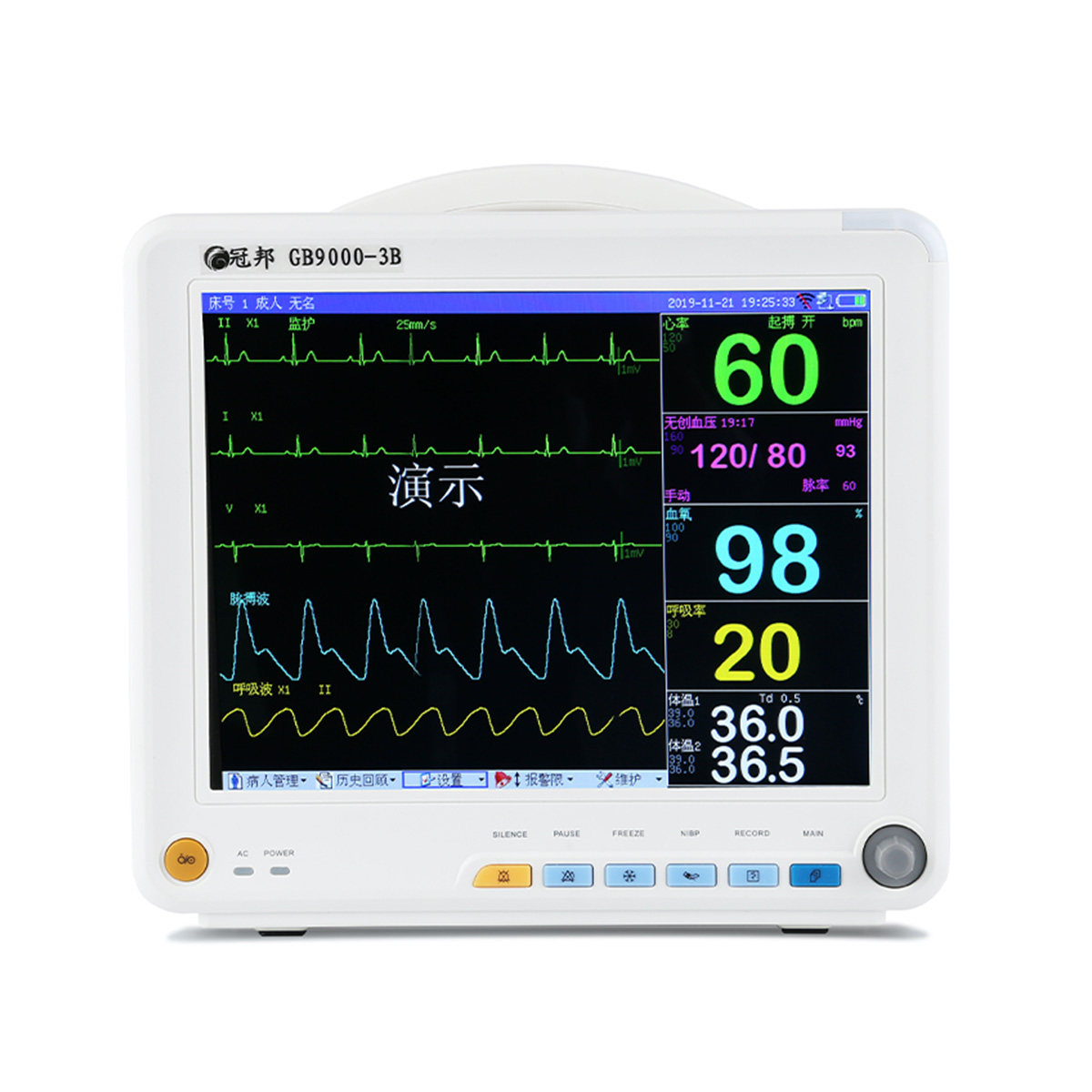 多參數(shù)監(jiān)護(hù)儀能為醫(yī)學(xué)臨床診斷提供重要的病人信息,通過(guò)各種功能模塊,可實(shí)時(shí)檢測(cè)人體的心電信號(hào)、心率、血氧飽和度、血壓、呼吸頻率和體溫等重要參數(shù),實(shí)現(xiàn)對(duì)各參數(shù)的監(jiān)督報(bào)警。信息存儲(chǔ)和傳輸,是一種監(jiān)護(hù)病人的重要設(shè)備。GB9000-3A多參數(shù)監(jiān)護(hù)儀適用于兒童和成人監(jiān)護(hù),可監(jiān)測(cè)參數(shù):心電、血氧飽和度、無(wú)創(chuàng)血壓、呼吸、體溫。